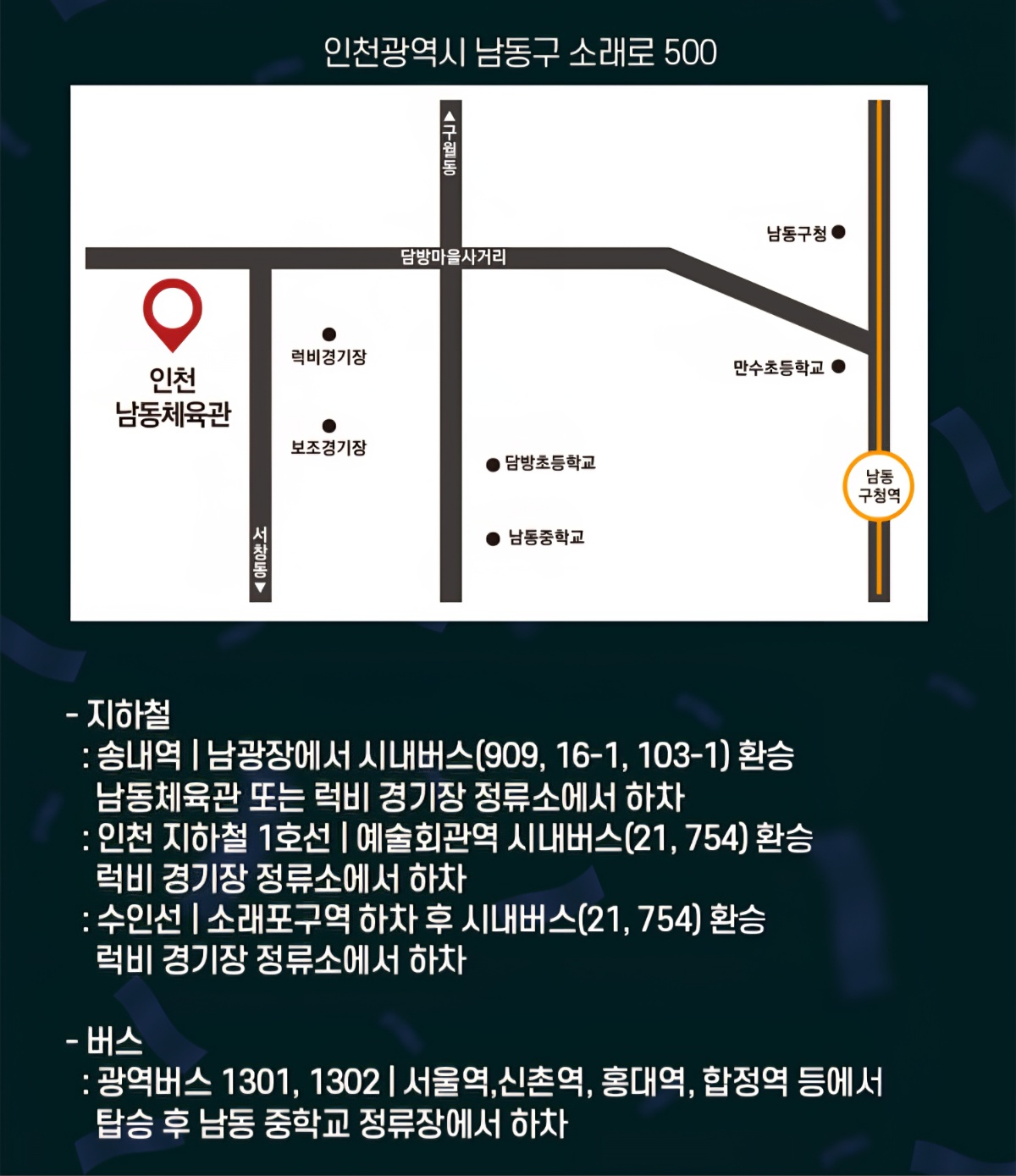 서울역에서 1호선 인천행 승차 -> 약 40분 -> 송내역 하차 -> 1번 출구 -> 150m(약 4분), 송내역 남광장 에서 시내버스(909, 16-1, 103-1) 또는 급행 99번 승차 -> 약 25분 -> 남동체육관(체조경기장) 하차 -> 도보 5분(약 260m) -> 남동체육관 O 서울고속버스터미널에서 오시는 길(약 1시간 20분 소요) 고속터미널역에서 9호선 김포공항행 승차(급행이 빠름) -> 노량진역에서 1호선 인천행 환승-> 약 25분 -> 송내역 하차 -> 1번 출구 -> 위와 동일 ------------------------------------------------------------------ 공연일시 : 2025년 12월 27일(토) 오후 6시, 2025년 12월 28일(일) 오후 5시 |