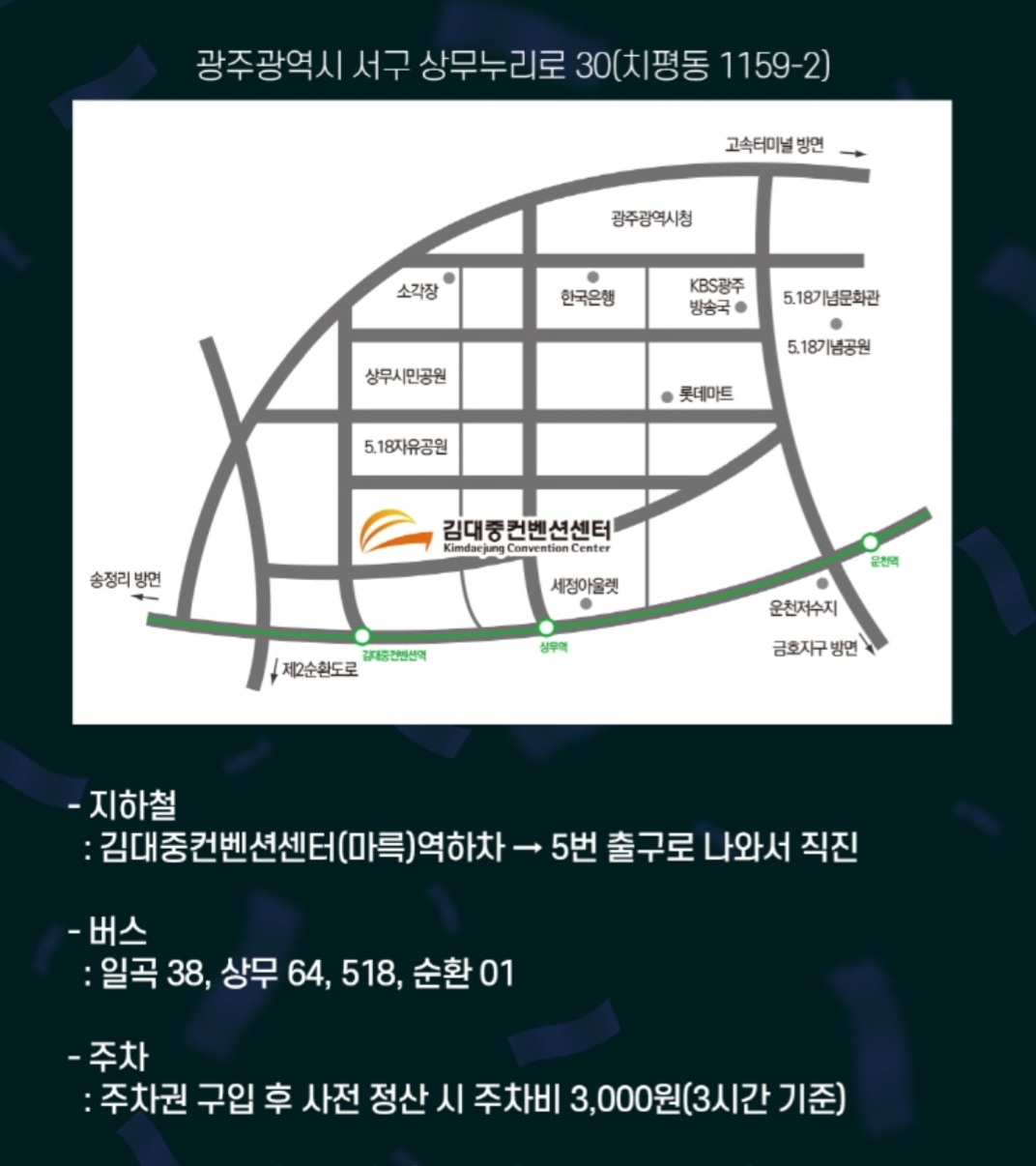 광주송정역 4번 출구 -> 지하철 1호선 승차(송정공원역 방면) -> 3개역(약 6분) -> 김대중컨벤션센터역 하차 -> 5번출구에서 약 430m(약 6분) O 광주종합버스터미널에서 오시는 길(약 30분 소요) 버스 급행 순환01B, 급행 좌석02, 지선518 : 5.18자유공원 하차 -> 약 220m(약 4분) 버스 간선 일곡38 : 김대중컨벤션센터 하차 -> 약 200m(약 3분) |