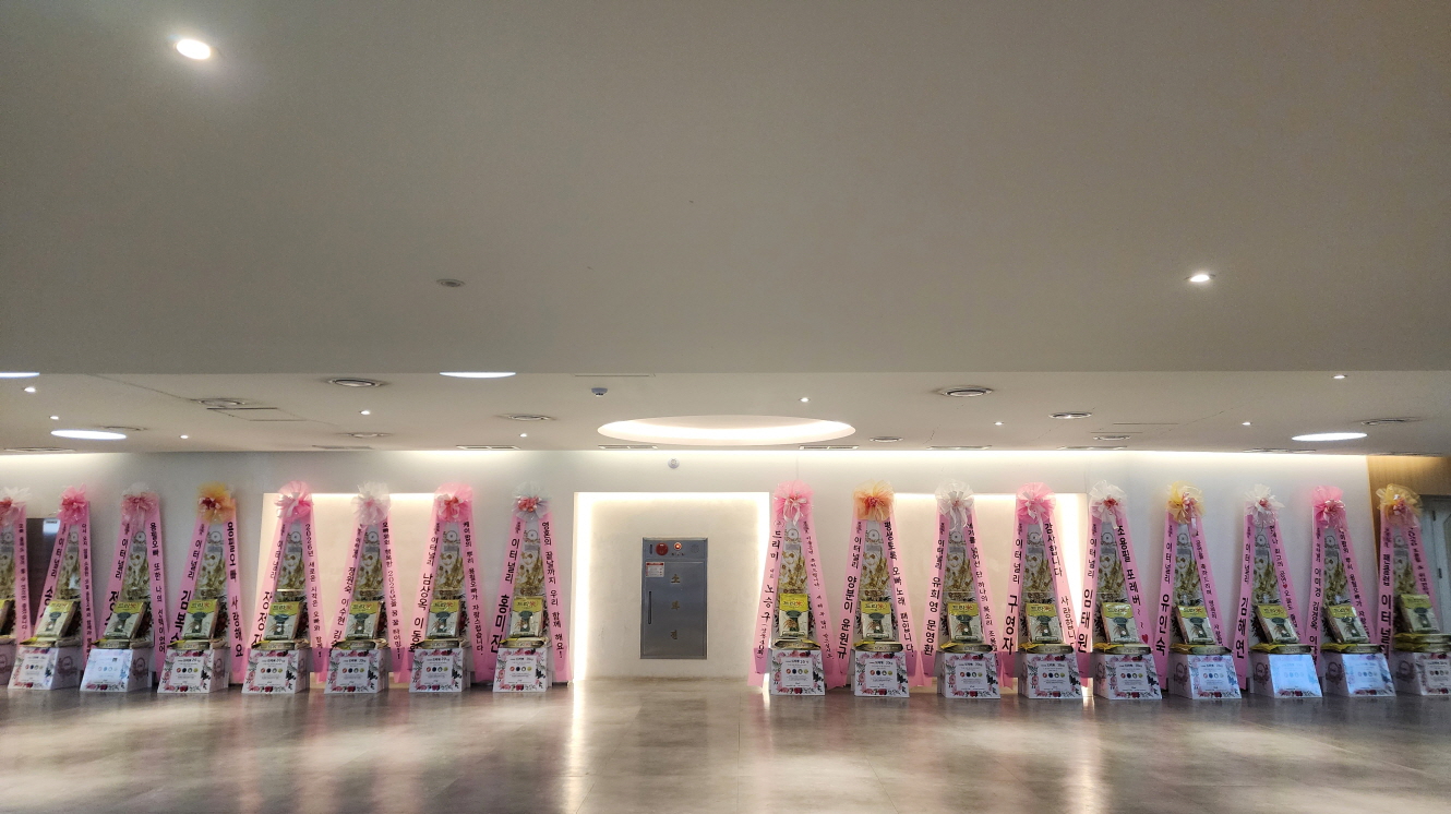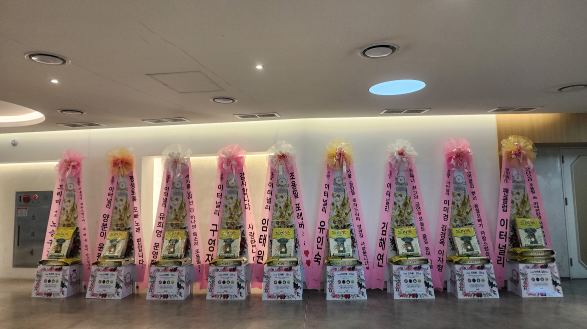 ![]() ![]() ![]() ![]() 드리미 쌀화환 갯수는 이터널리 1개, 회원들 16개, (주)드리미 노승구 대표 1개, 총 18개(쌀수량: 370kg)이고, KSPO DOME 내 VIP 대기실 앞 로비에 설치했습니다. |